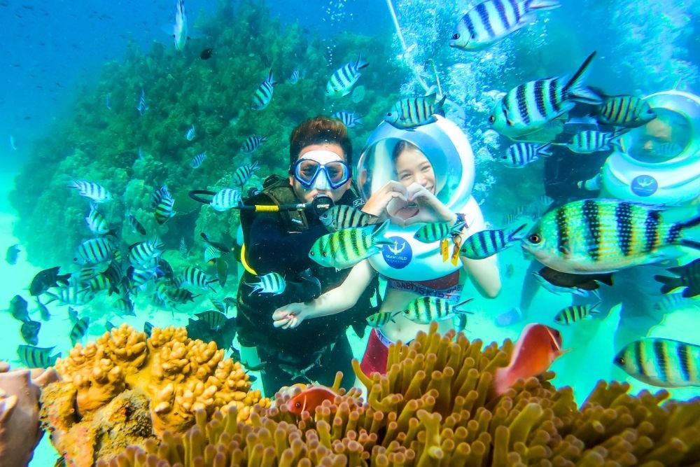 Sea walker (pay by yourself): a new type of service, walk under the ocean, there are the fish flocks swimming & colorful corals reef of Phu Quoc Speed boat arrives Thom Island: Enjoy the water park – more than 20 modern games from the world’s leading manufacturers.