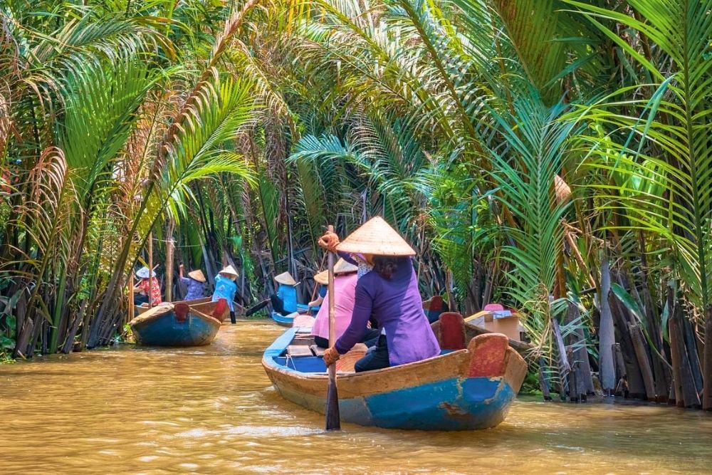 Mekong delta is known as The Nine Dragon River delta since it is formed by nine rivers. The background of this area is the largest site of endless paddy fields, coconut farms, tropical gardens. Morning, drive to My Tho, known as the "rice basket" in Vietnam. Upon arrival Cruising through Mekong River, passing a fishing village. Visiting some small islets as Turtle, Dragon, Phoenix Island,.. under a green canopy of water coconut trees. Walking through some villages to a fruit garden. Taste tropical fruits, while having live traditional music. Have honey tea. Short rowing boat ride, enjoy the nice boat ride through natural island and canals in Ben Tre under the shadow of the water coconut trees...